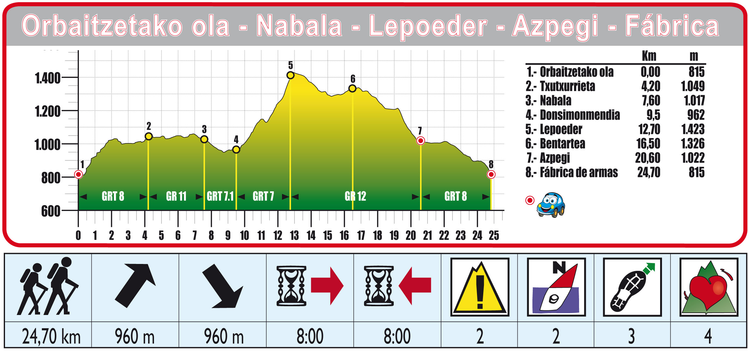 Desde la Fábrica de armas de Orbaitzeta, tomar el GRT 8 hacia el O, para conectar con el GR 11 en Txutxurieta, continuar por el GR 11 hasta Nabala, donde se toma el enlace GRT 7.1 que, sin apenas desnivel nos lleva al poste de Donsimonmendía, desde aquí se inicia un ascenso por el GRT 7, que en algunas zonas es pronunciado, se salvan más de 400 metros de desnivel, para llegar a Lepoder, punto más alto del recorrido. Desde aquí tomamos el GR 12, que se torna más suave, llegamos al collado de Bentartea, primero y Azpegi después (habiendo dejado próximos los montes Txangoa y Urkulu). Desde Azpegi, en descenso por el GRT 8, llegamos nuevamente a la Fábrica.